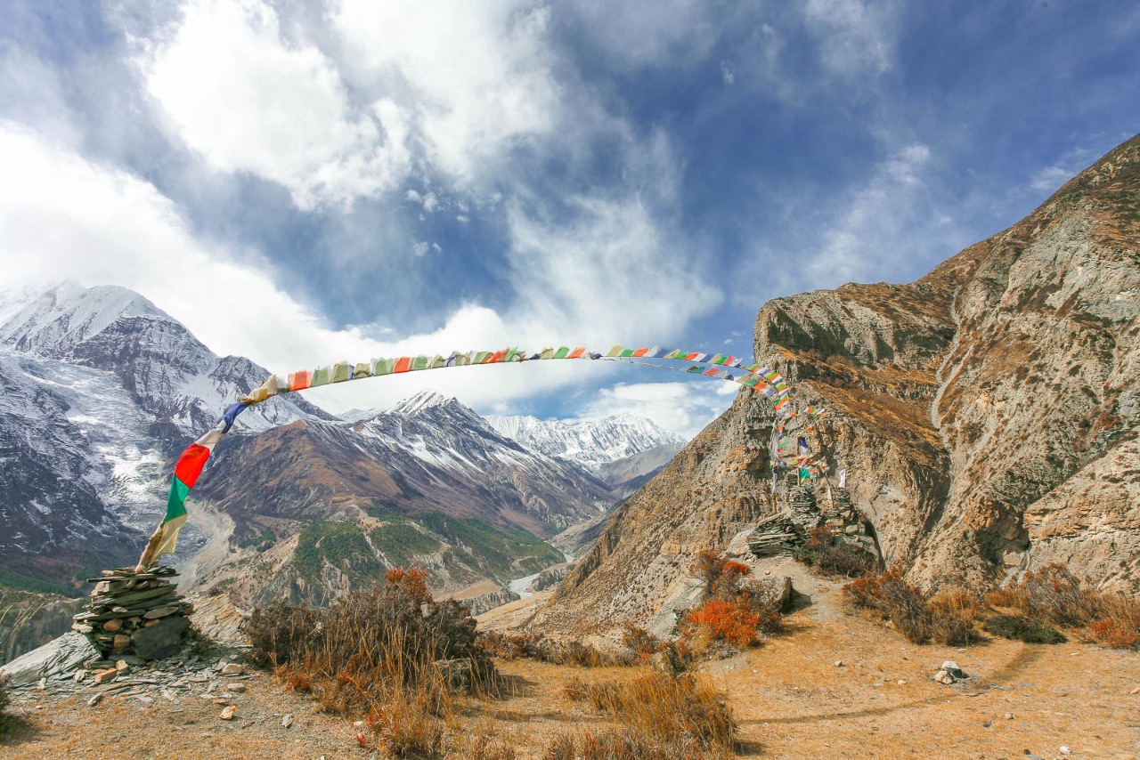 Gebetsfahnen und Blick auf den Annapurna South, 7219 m